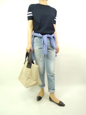 | 流行のクラッシュデニムを紺のニットでシンプルに合わせてチェックのシャツがアクセントに!アクティブ度100%。 |