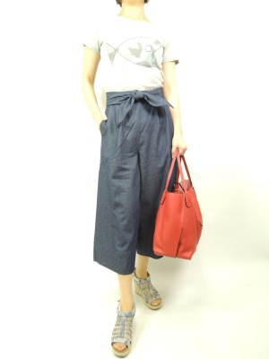 デニム地のガウチョはサッシュベルトで可愛らしく。カジュアルTシャツでデイリーを楽しく!アクティブ度90%、スタイリッシュ度10%。