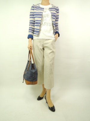 麻素材のガウチョは夏まで涼しくはける一着。ジャケットでコンパクトにまとめると素敵です!スタイリッシュ度90%、エレガンス度10%。