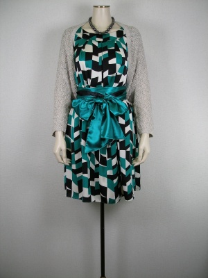 Aラインのワンピース。サッシュベルトを大きく前でリボン結び。インパクトのあるワンピースを短いボレロで合わせて!エレガンス度80%、フェミニン度20%。