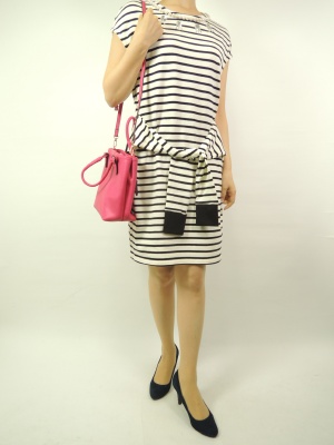 腰巻き風にデザインされたワンピース。着やすい素材にも関わらずビジューをあしらったお洒落なカジュアルワンピース!フェミニン度70%、アクティブ度30%。
