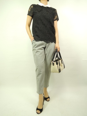 清楚なイメージの白襟はモノトーンが程よくきちんと上品です。合わせるなら綺麗目パンツスタイルで!スタイリッシュ度80%、フェミニン度20%。
