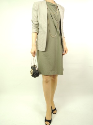 すとんと落ち感のあるワンピースにジャケットを肩にかけて、固すぎない大人のコーディネート!エレガンス度70%、スタイリッシュ度30%。