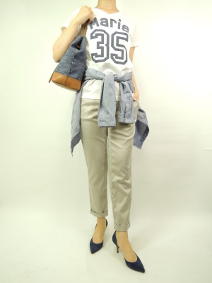 やや光沢のあるカジュアルパンツ。ざっくりカットソーとシャツでラフな装いに!アクティブ度70%、スタイリッシュ度30%。