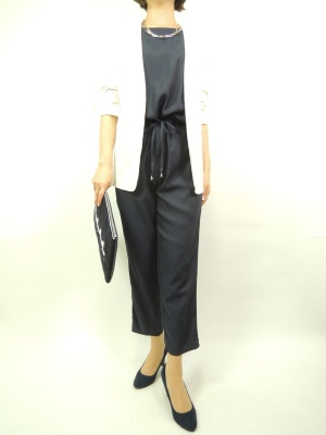 とろみの生地のオールインワンはウエストで絞るタイプ。ロングジャケットを羽織ってシャープな印象に!スタイリッシュ度70%、エレガンス度30%。