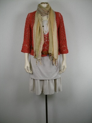 シンプルなロング丈カットソー。裾からフリルのキャミワンピをのぞかせて、ワンピース風にアレンジ。短めの丈のざっくりニットとアースカラーのストールでナチュラル感を出します!アクティブ度70%、フェミニン度30%。