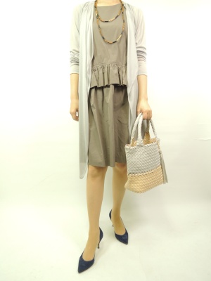 ベーシックな色合いのノースリーブワンピ。ちょっとお出かけに重宝。今年はやはりロングカーデで合わせたい!エレガンス度80%、スタイリッシュ度20%。