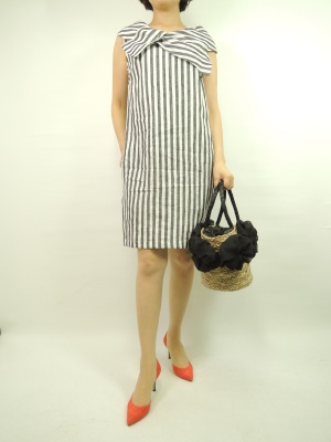 胸元のリボンデザインがオシャレなサックワンピース。夏のお出かけにピッタリな一着!エレガンス度70%、スタイリッシュ度30%。