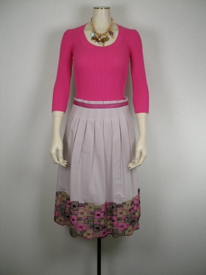 淡ピンクの刺繍入りスカートに濃ピンクのニットで、春を満喫。お出かけしたくなりますね!エレガンス度60%、フェミニン度40%。