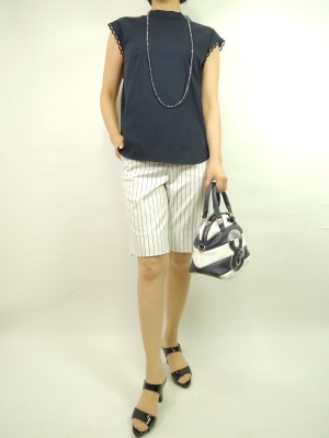 | 大人だからノースリーブが似合う。濃いめのネイビーでパンツとのコントラストにメリハリをつけて!フェミニン度70%、スタイリッシュ度30%。 |