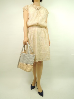 フロッキー加工の生地を用いた上下。勿論別々に着こなしても良いが、トップスをインしてワンピースの様に着こなす!エレガンス度90%、フェミニン度10%。