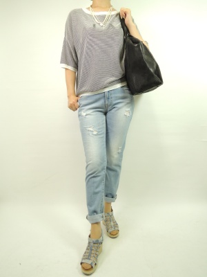 デニムファッションはスクエアのニットをざっくり着る。自然体の楽ちんコーディネートはデイリーに欠かせません!アクティブ度90%、フェミニン度10%。