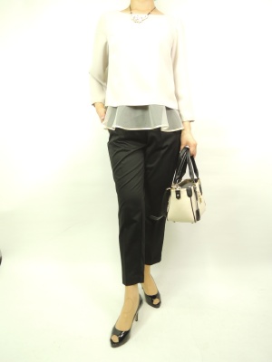 光沢感のティーパードパンツとオーガンジーのブラウスでエレガントな装いになる。パンツ派の方のパーティーファッションにお薦め!エレガンス度90%、スタイリッシュ度10%。