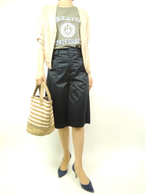 ハリ感のある生地のガウチョパンツはお出かけにピッタリ。カーキ系を合わせればネイビーが映えますね。ランチスタイルに!フェミニン度80%、アクティブ度20%。