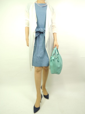 デニム地のワンピースはカジュアルなイメージですが、大きなリボンがエレガントに見せてくれますね。ロングカーデでスッキリまとめてみました!エレガンス度70%、フェミニン度30%。