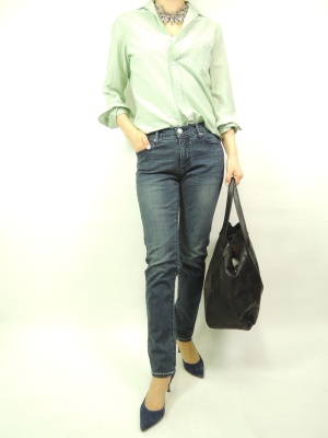 シンプルでもきらっと光る着こなしをするには今年顔のシャツを緩く合わせるとよりオシャレ度が増します!スタイリッシュ度70%、アクティブ度30%。