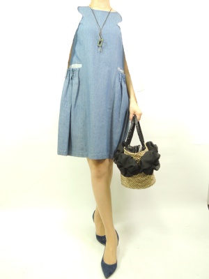 フェミニンなデザインのワンピースもデニムだとデイリーにも着こなせる。カットソー地のカーデは肩に羽織って!エレガンス度70%、アクティブ度30%。