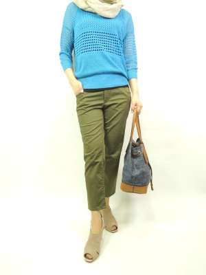 カーキ×ブルーの組み合わせ。ニットの下にあえて黒のタンクトップでシックにまとめて大人のカジュアルに!アクティブ度90%、スタイリッシュ度10%。
