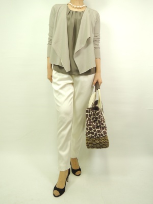 ロングカーデの多い中、これくらいの丈も合わせやすくて一枚はあると便利。オフ白ののパンツでシックな色合わせは上品ですね!エレガンス度70%、スタイリッシュ度30%。