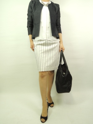 通勤やONの時のファッションはタイトスカートがお薦め。カジュアル生地のJKで少し抜け感を出して!スタイリッシュ度90%、エレガンス度10%。