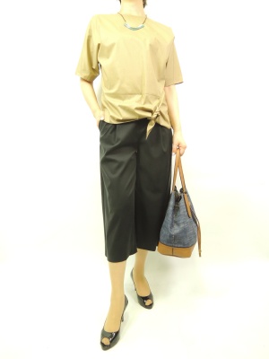 黒のガウチョは重く見えますが、少し丈が短いのでその心配はありません。裾にポイントのゆるデザインでバランスよく!スタイリッシュ度80%、エレガンス度20%。