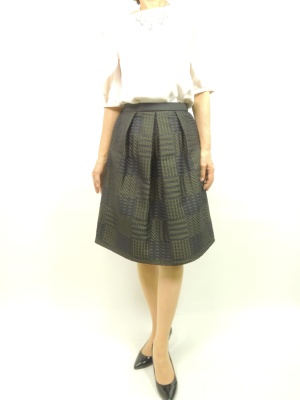 ふんわり袖にはふんわりスカートで。カーキベースの地味色なので甘さ控えめになりますね!フェミニン度80%、エレガンス度20%。