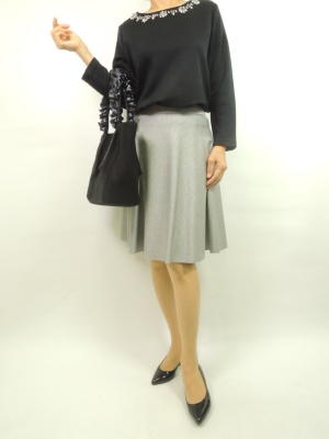 フレアースカートにはシンプルなカットソーが一番。胸元のビジューがアクセサリー変わりでフェミニンな印象ですね!フェミニン度70%、エレガンス度30%。