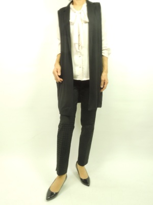 ベスト(ジレ)も今季ならではのアイテム。ボウタイブラウスと黒のパンツでシンプルに!スタイリッシュ度90%、エレガンス度10%。