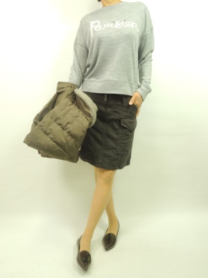 カーゴスカートはコンパクトにまとめて。秋にはダウンベストを組み合わせてカジュアルに!アクティブ度80%、フェミニン度20%。