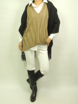 フォークロアのポンチョはロングブーツで足元を細く見せるとバランスが良い。大判ストールは一枚巻くだけでオシャレ度アップしますね!スタイリッシュ度80%、エレガンス度20%。