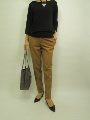 センターライン入りのきちんとしたパンツはそれだけできちんと感が出る。黒でベーシックにまとめて秋の学校行事に!エレガンス度70%、スタイリッシュ度30%。