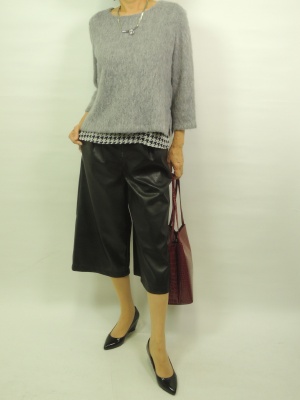 合皮のガウチョパンツにスクエアニットでコンパクトなシルエットを出して!スタイリッシュ度70%、エレガンス度30%。