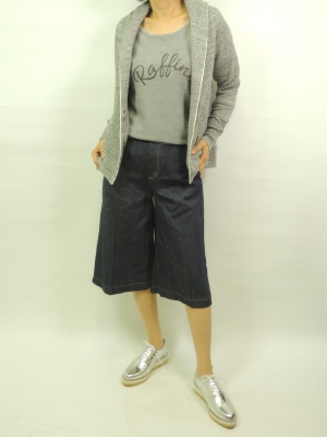 変形パーカはデニムガウチョが良く似合う。デイリーにもオシャレをしたい日にピッタリ!アクティブ度90%、フェミニン度10%。