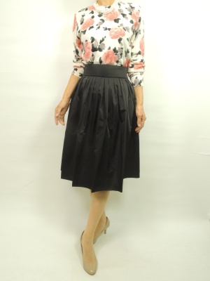 花柄のプリンンが大人可愛い。黒のふんわりスカートでよりフェミニンにコーデ。フェミニン度80%、エレガンス度20%