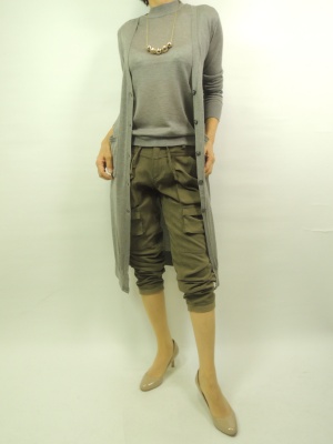 アンサンブルのニットカーデとインナーの長さがアンバランスなのが今年風ですね。カーゴパンツで綺麗目カジュアルに!スタイリッシュ度90%、アクティブ度10%。