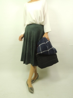 マットな風合いのスカートは色に注目。深みのあるグリーンはこの秋のトレンドですね。綺麗目のコーデでまとめて!フェミニン度80%、エレガンス度20%。