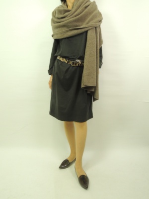 ゆるいデザインの大き目ワンピースをベルトでアレンジして着こなす。ポイントはヤク100%の大ぶりストールをざっくり巻いて!エレガンス度70%、スタイリッシュ度30%。