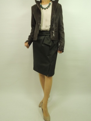 ブラウス+スカートにハードな皮革ジャンを合わせて大人っぽく着こなす!エレガンス度70%、スタイリッシュ度30%。