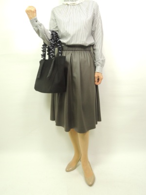 クラシックなデザインのブラウスにグレーのスカートで柔らかいイメージを作る。パールネックレスがよりクラシカルに映りますね!フェミニン度80%、エレガンス度20%。