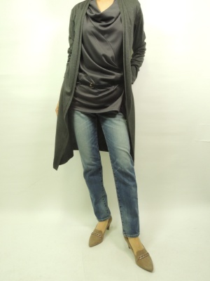 ロングカーデをエレガントに着こなすにはインナーのブラウスを女っぽいデザインにするとお洒落に!スタイリッシュ度70%、エレガンス度30%。