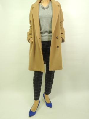 キャメル色のコート。ビッグシルエットのチェスターコートです。そろそろアウターも・・。というあなたにお値段もリーズナブルですね!スタイリッシュ度90%、エレガンス度10%。