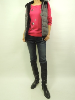 ハッとするような綺麗な色のニット。デニムコーデはこの位の色でもOKですね。ダウンベストでバランスをとって!アクティブ度80%、スタイリッシュ度20%。
