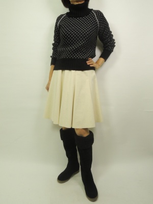 フレアースカートにロングブーツ。白と黒でメリハリを効かせたスタイリング!フェミニン度70%、アクティブ度30%。