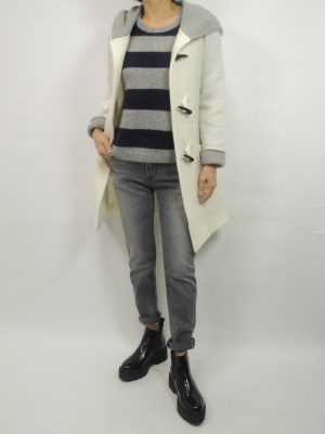ボーダー柄のニットに黒のデニム。アウターに白を加えて明るさをプラス!アクティブ度90%、スタイリッシュ度10%。