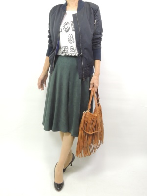 ナイロン素材のブルゾンをスカートで女らしくコーディネート。アクセントにフリンジバッグで流行を入れて!フェミニン度80%、スタイリッシュ度20%。
