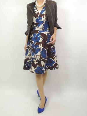 エレガントな花柄ワンピースを皮革のブルゾンで甘辛に仕上げてみました。パールのアクセサリーで女らしく表現!エレガンス度70%、スタイリッシュ度30%。