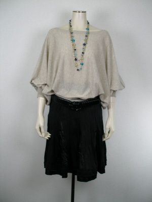 ドルマンスリーブはとてもエレガントな形ですね。スカートはハギの部分が異素材で動くたびに変化が楽しめます。上品なシルエットは女らしくもあります!エレガンス度100%。