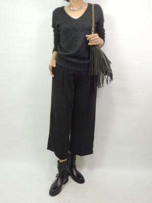 シンプルなニットと太目のワイドパンツでざっくり合わせる。足元をエンジニアブーツでよりマニッシュに!スタイリッシュ度90%、エレガンス度10%。