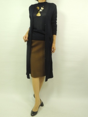 流行のゴングカーデをタイトスカートで合わせる。ネイビーとライトブラウンのコントラストもこの秋のお洒落!エレガンス度60%、スタイリッシュ度40%。