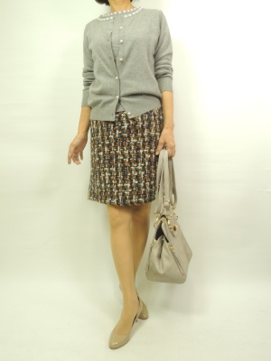 アンサンブルになったニットをミニスカートで組み合わせる。首回りにあしらったパールでアクセサリーいらずのコーディネート!フェミニン度80%、スタイリッシュ度20%。